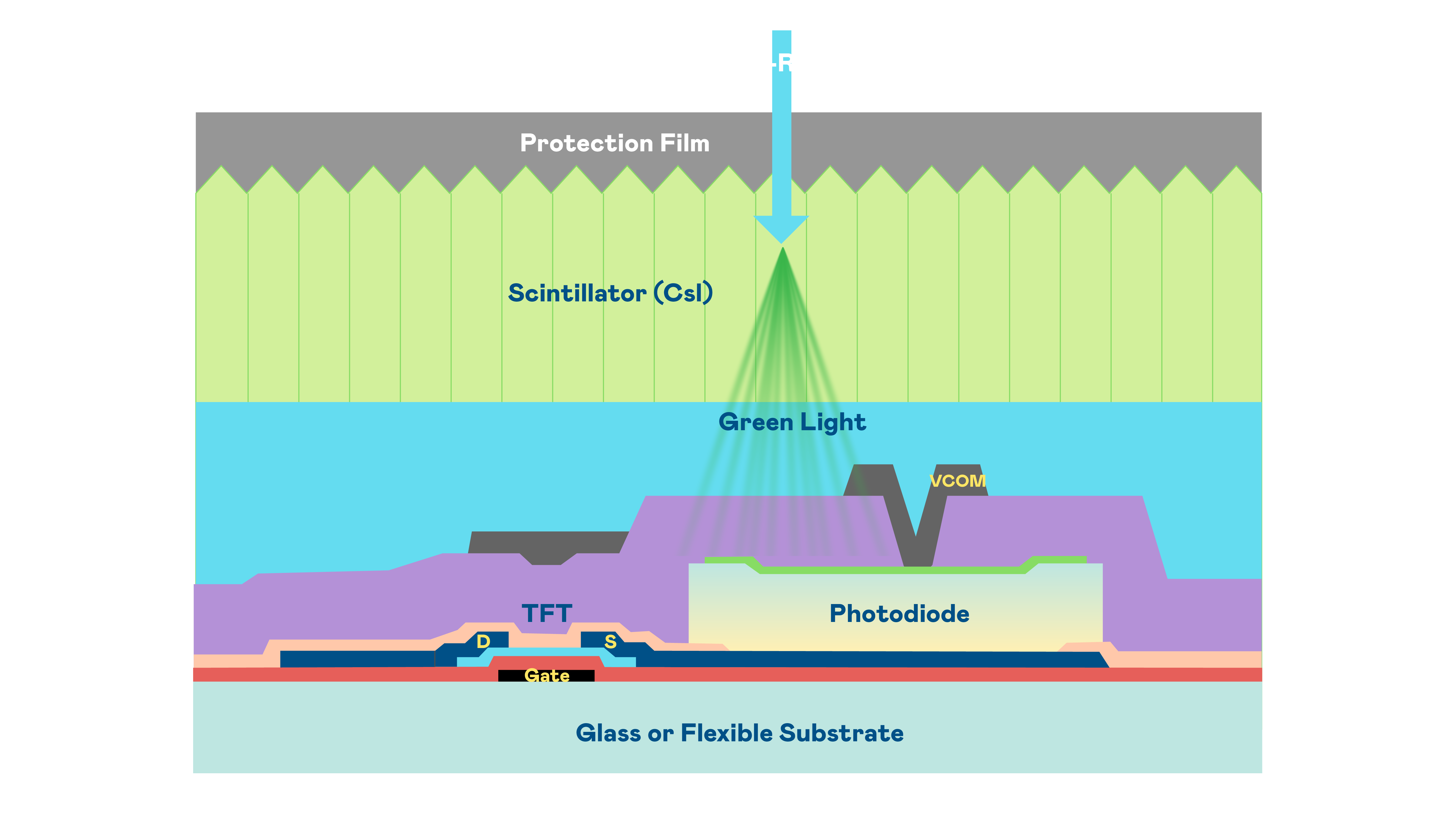 j9九游会首页登录的X光影像感测阵列使用薄膜电晶体 (TFT) 作为每个像素的读取开关,搭配光电二极体(Photodiode)的光电转换元件,用以感测X光影像讯号。